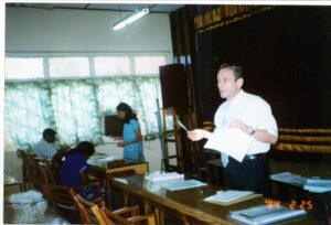 That was a time when there were not much support materials. There were not any model papers or CDs for the listening test. The internet was a luxury, only used to send e-mails in many cases. The only available material was the handbook from Cambridge University, introducing two sample test papers. The teachers had to record the listening tape scripts using local voices. They retyped the sample paper given in the handbook to be distributed among parents, to convince them that their children should be able to sit for the exams. Finally, with all their genuine efforts they could only collect 71 students – 57 KET and 14 PET candidates. In order to persuade Headway, British Council generously agreed to come, although the number was not what they had wished for. In June 2003 the first ever Cambridge ESOL exam session in the eastern region was successfully conducted, headed by Mr.Gerald Yorwerth. Incidentally, for British Council, this was their first ever exams in an outstation venue.